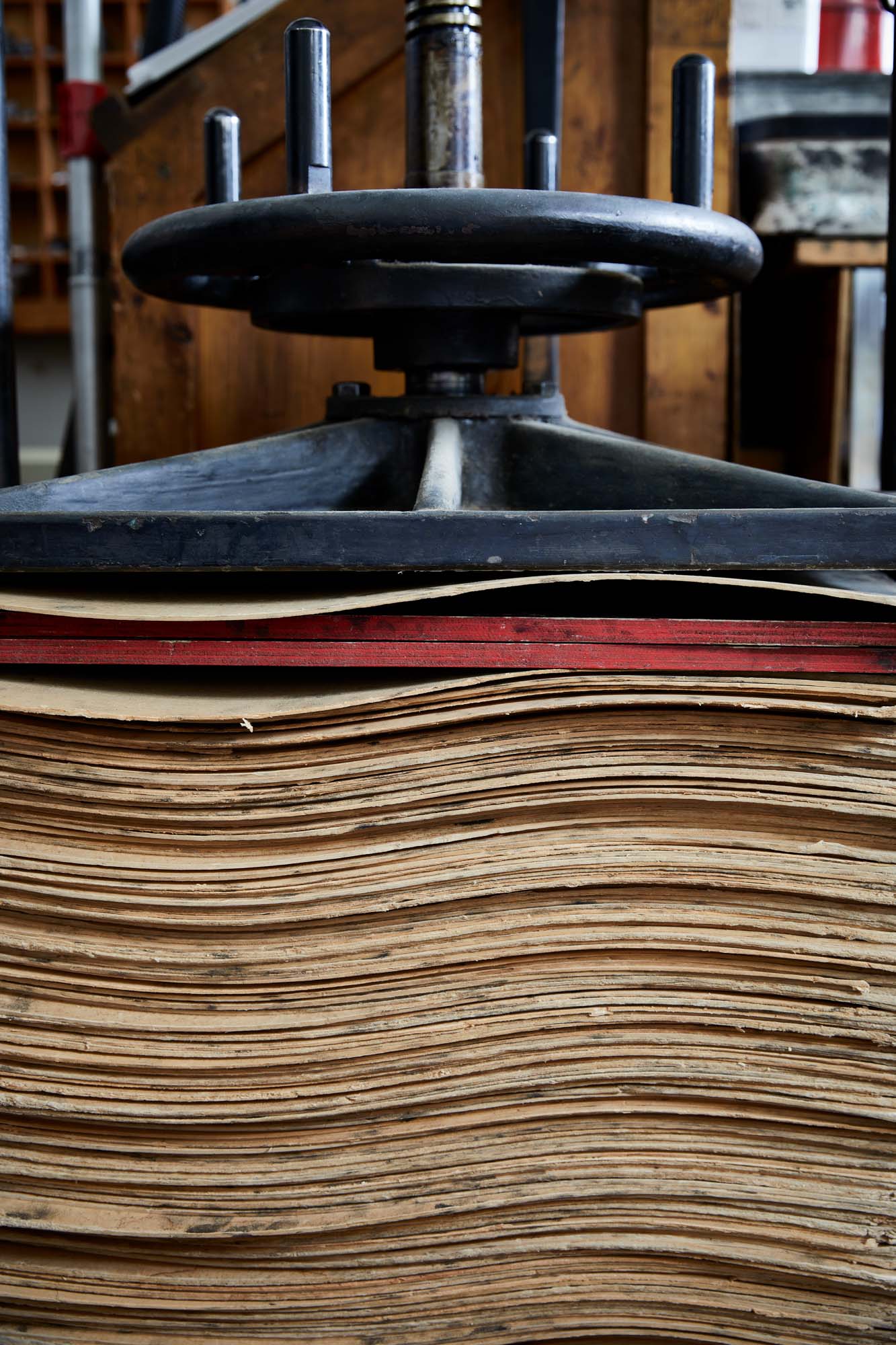 När stampverket dunkat klart är det dags att göra pappersark. Tre hundra liter varmt vatten blandas med tio liter linvälling i en kyp, ett stort kar. Richard rör om så att vätska och fibrer blandas och sänker snabbt ner en pappersform. Den ser ut som en tavelram med metallnät. Han har snickrat ramen efter gamla ritningar och metallnätet har han vävt själv. Inträngd i ett hörn i källaren står en oansenlig vävstol.