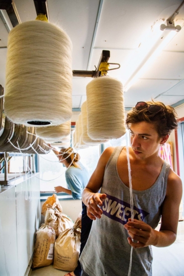 – Det är mycket hemmabyggen här, konstaterar Sonia och Roger i spinneriet och pekar på en avsågad, böjd spik, som fungerar som krok till en lina i torkmaskinen. Gallret som lyfter upp ullen ur tvättkaret är en egenhändig konstruktion av ett gammalt plastnät på en metalldel som förmodligen använts till något helt annat tidigare.