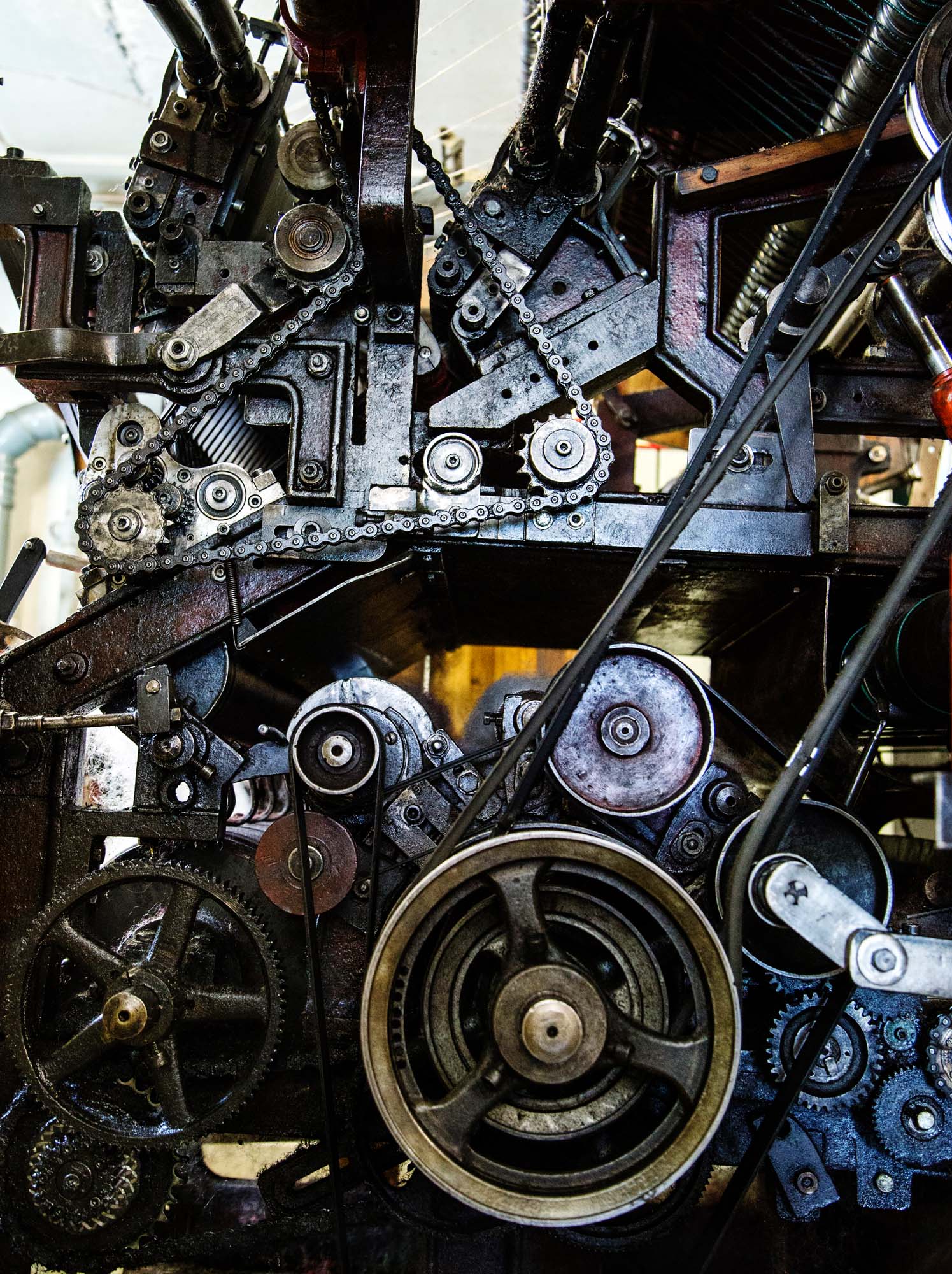 Hon trycker på en knapp och ett brusande slammer fyller väveriet. Valsar rullar och ullflor fördelas, kedjor och kugghjul i gjutjärn bestämmer spinnhastigheten, och läderremmar – de där som går av ibland – sträcker ullfibrerna och matar upp dem mot roterande spolar.