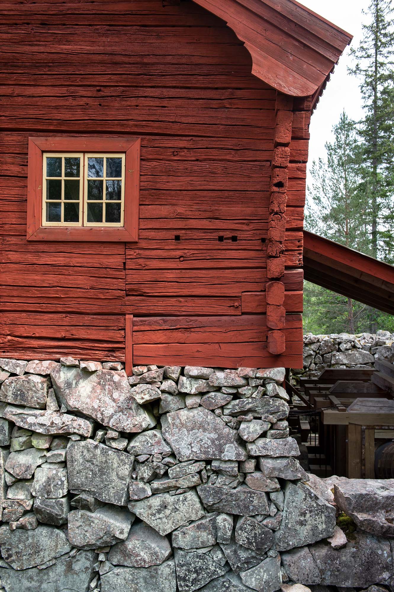 En bit från ladudörren väntar en metertjock ekstock invid en trave furustockar där kärnveden breder ut sig som en mörk skugga över sågsnitten.