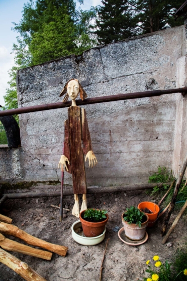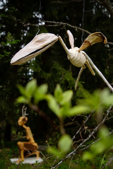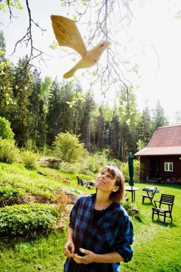 Som urtidsdjuren ute på baksidan av huset. De började som en bild och en känsla som Inga sedan formade materialet efter. En väldig revbensbåt av bräder och älghorn gungar majestätiskt i vinden och bredvid svävar en urtidsfågel med slutna ögon. Okläckt ser den ut. Värnlös. Som något som ännu inte fått bli till. Man vill bara ta den i famnen, hålla den och försiktigt önska den livet.