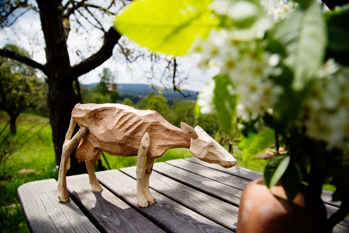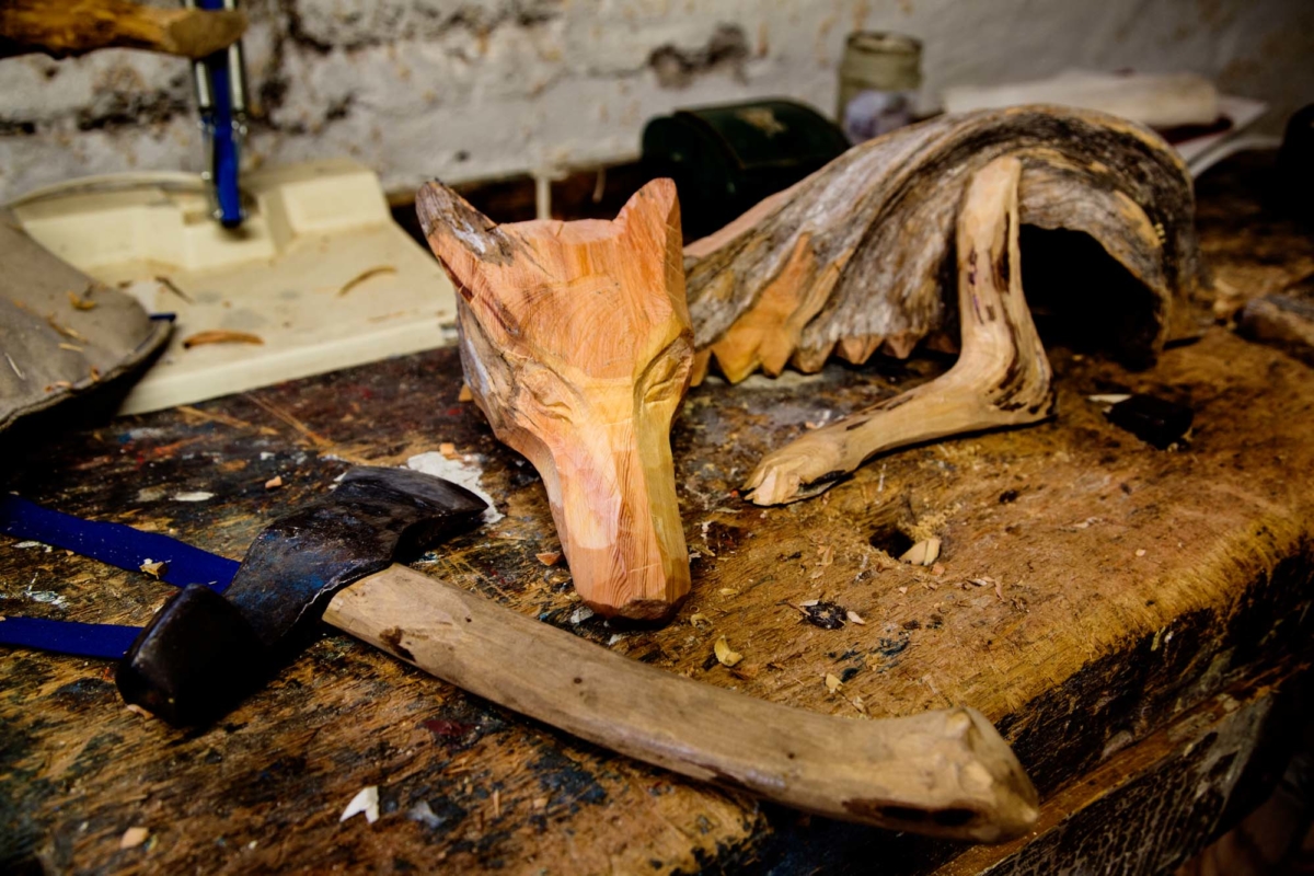 I verkstaden blir det även annat än kor. Just nu ligger en rävunge och sover på snickarbänken bland yxor, skölpar och stämjärn. De stora sakerna kapar Inga Hjolman med motorsåg, men finliret görs med de mindre eggverktygen. Ofta är det själva träet som sätter igång skaparlusten.