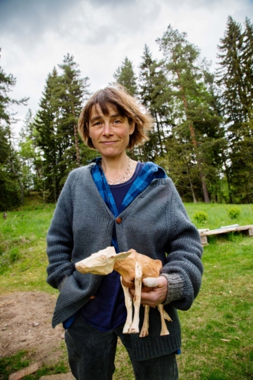 Själv har hon alltid gillat både kor och trä. Som liten täljde hon gubbar och barkbåtar. Och hämtade mjölk hos grannen som hade djur. Som vuxen gick hon ett år på Nyckelviksskolan där hon förutom att ägna sig åt konst också lärde sig leka. Innan dess hade hon gått en utbildning inom lantbruk och djurskötsel. Hon har jobbat med kor i närmare trettio år men menar att det hela tiden finns mer att lära.
