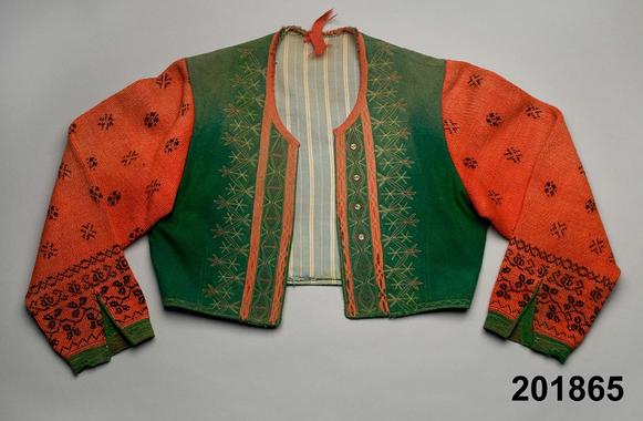 Garn: tvåtvådigt z-tvinnat ullgarn. 2 hg rött, 1 hg svart