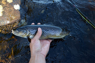 Nu ville jag se om någon annan fluga kunde fungera. Jag knöt på en Tippet and Silver. En fluga jag blivit förtjust i genom Hans Lidmans skrönor. Nu ville jag se om det gick att få fisk med den – i Ljusnan. Långt ner i forsen högg det. En liten öring gjorde två höga språng när den blev krokad. Två ljusnanöringar kändes inte så illa.
