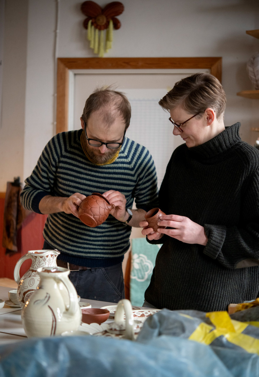 Men nu är vi här, på Rackstadmuseet i Arvika, där deras projekt i slutänden kom att ställas ut. På ett bord i mitten av rummet står kannor, tallrikar, koppar och två små tekannor. De flesta har fått sin röda skärv doppad i vit lera, och sedan har Joel och Kristine skrapat fram mönster genom att rista bort det vita. Sgrafitto, som det heter på keramikerspråk. Och trots att deras uttryck vanligtvis skiljer sig ordentligt från varandras, är det svårt att se vem som har gjort vad.