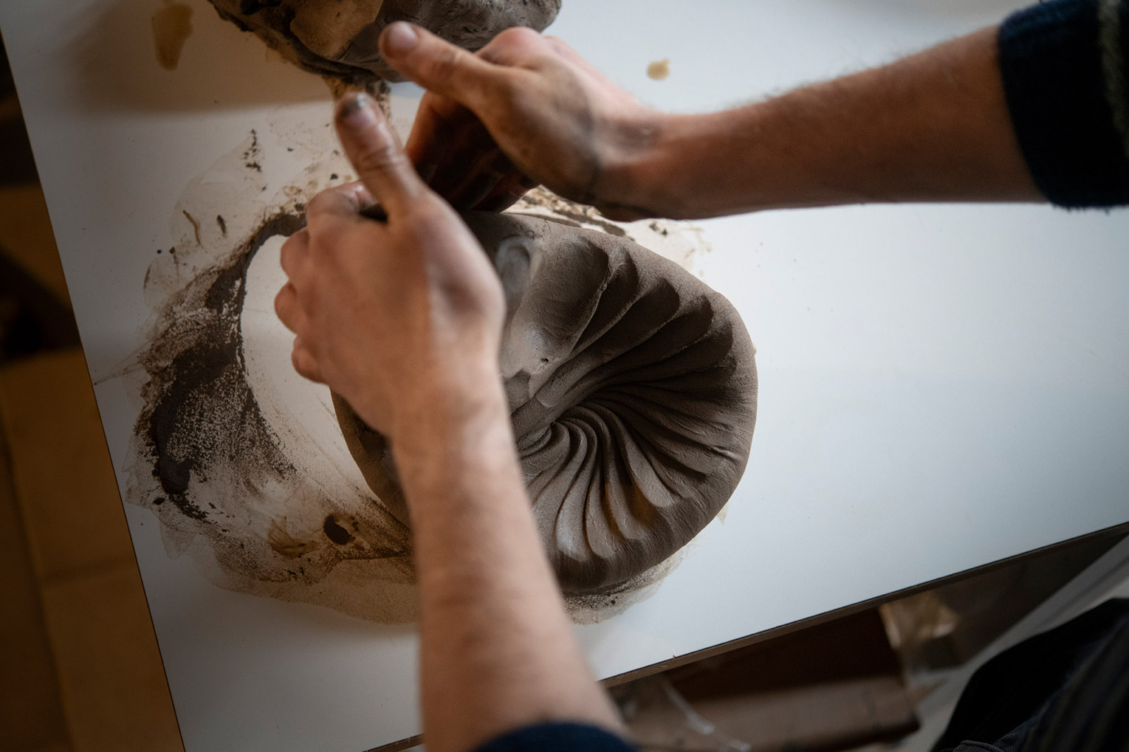 Sommaren 2023 hade de så hämtat den lera som de behövde för att kunna göra sina prover. Ändå var det veckor kvar tills den kunde användas på drejskivor och kavlingsbord. Bruksproduktion förutsätter homogen lera befriad från alla eventuella orenheter. Och det, i sin tur, förutsätter ett jäkla jobb.