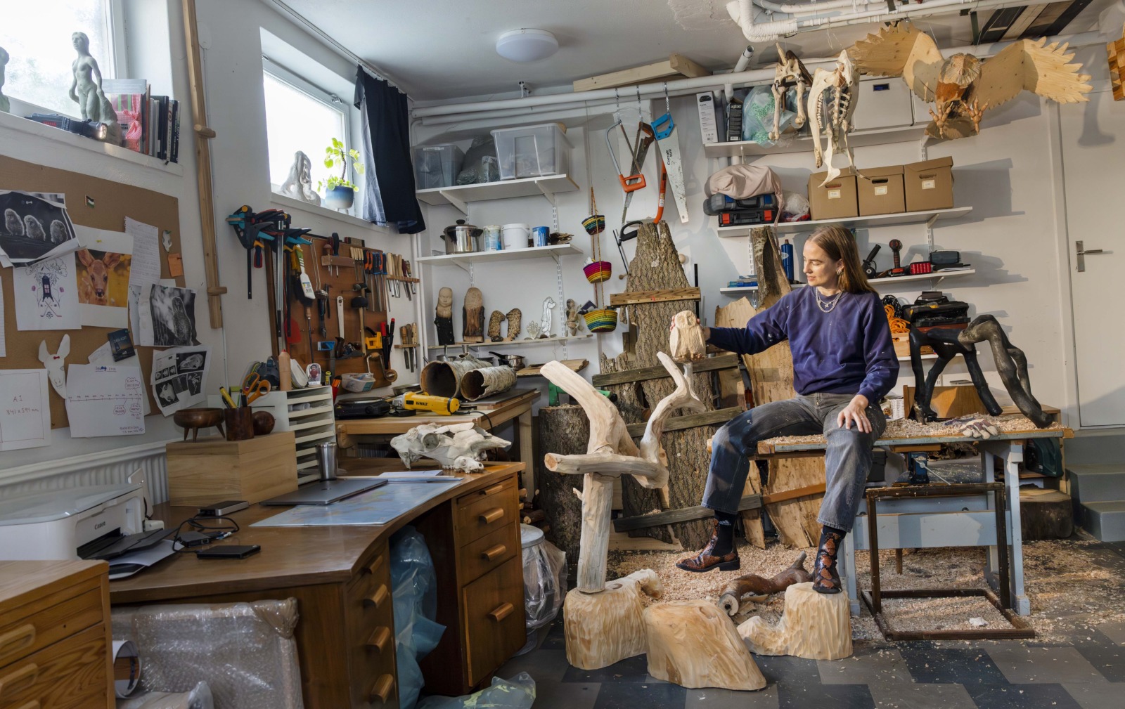 Konstnären Elin Magnusson i sin ateljé. – Nyligen täljde jag barnansikten. Det var efter att jag tänkt mycket på vad barnen i Palestina utsätts för. Det var också första gången som jag testade att jobba i lind.