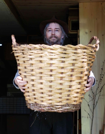 Sen flätar han sig upp längs korgens väggar och avslutar med att göra de två handtagen – eller greparna. Men det gäller att han valt rätt ämnen från början, att de fyra pinnar som följt med hela korgen igenom och som till slut blir handtag är av rätt slags virke.