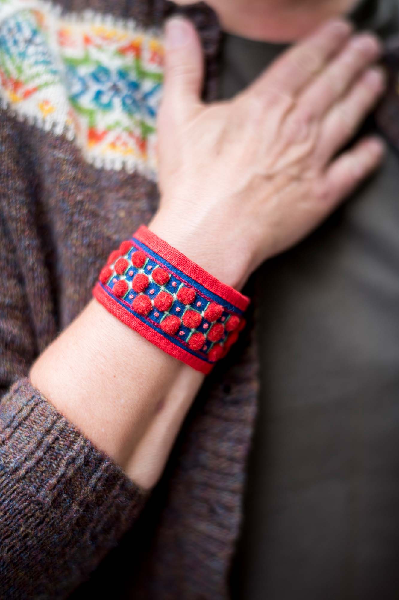 Dekorationerna kan vara vad som helst: tofsar, plattsömsprickar, knutar… Jag tycker om att testa mig fram förutsättningslöst. Vad händer om man gör ett större galler eller byter ut materialet? Jag testade att virka en rad luftmaskor som jag sedan använde som galler. Jag använde en grövre nål, och sedan var det lite pill med att få det på plats eftersom jag gärna ville ha den räta sidan uppåt. Men det var helt klart värt besväret. Gallret stod ut mer och gav broderiet en tredimensionell effekt, och det var precis vad jag ville. Jag tycker om när ett mönster känns under fingrarna.