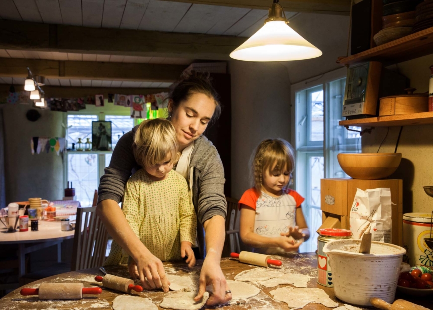 Några som valt att gå steget längre är Mi och Ove Möller. De bor med sina tre döttrar i Arkelstorp utanför Kristianstad. De har också arbetat med köket, men knappast renoverat i säsongens färg. En gråkall vinterdag när Hemslöjd hälsar på silas solljuset genom växthuset som löper längs husets södra och västra väggar. Strålarna når de omaka fönsterparen i köket och träffar en diskokula som hänger ovanför bänken. Mi Möller sitter vid köksbordet och virkar medan äldsta dottern Elna nystar upp garn på en nystvinda. Allt här inne är gjort med återbruk och naturmaterial. Väggarna är isolerade med lera från trakten och den enda värmen kommer från vedspisen mitt i huset. Köksbänkarna är hopsnickrade av furureglar och har draperier istället för skåpluckor. Mest för att det var enklast så. Under en av bänkarna sitter tre knotiga täljda kvistar som ett glest galler framför ett öppet skåp. Dem gjorde Mi medan Ove och en vän byggde bänkstommarna.