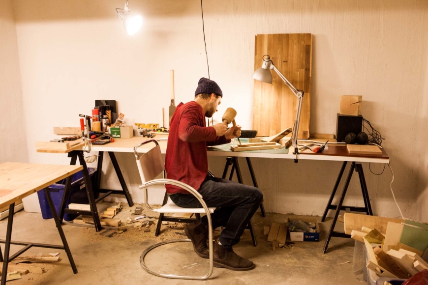 I våras gick han ut formlinjen på Beckmans Designhögskola. Examensarbetet gick ut på att han styckade och återanvände delarna från en hel soffa som han fått gratis från en bortskänkessajt på nätet. Det är den metod han nu filar vidare på i sin källarstudio. Runtom i lokalen står upphittat material lutat mot väggarna. En marmorplatta, en ljuddämpare från en bilmotor, massor av trä i olika form.