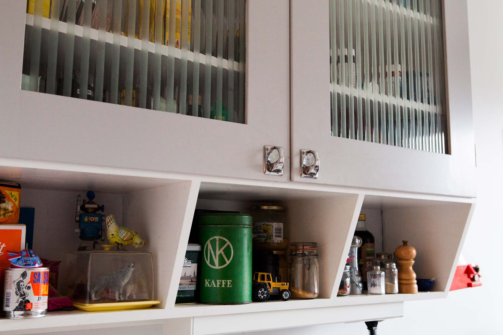Den enes skräp, den andres funkispärla. Yvonne Brax-Kjellström sa ja till idén och Leif Persson dök ner i sitt förråd av hela skåp, halva bänkskivor och lösa brädor. Den som kliver in i köket idag kan vid första anblick luras att tro att det är ett originalkök från 40-talet när huset byggdes. Men tittar man noga märker man att ingen lucka är den andra lik. Alla höjder och bredder är olika. Och skåpen kommer egentligen från flera olika decennier.