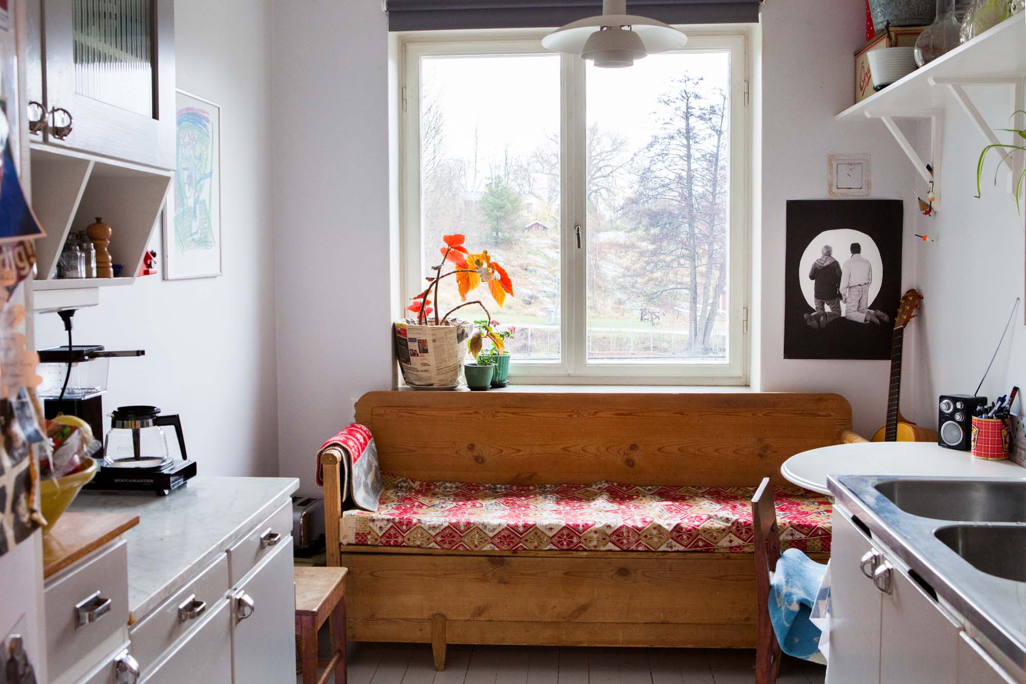 Några som valt att gå steget längre är Mi och Ove Möller. De bor med sina tre döttrar i Arkelstorp utanför Kristianstad. De har också arbetat med köket, men knappast renoverat i säsongens färg. En gråkall vinterdag när Hemslöjd hälsar på silas solljuset genom växthuset som löper längs husets södra och västra väggar. Strålarna når de omaka fönsterparen i köket och träffar en diskokula som hänger ovanför bänken. Mi Möller sitter vid köksbordet och virkar medan äldsta dottern Elna nystar upp garn på en nystvinda. Allt här inne är gjort med återbruk och naturmaterial. Väggarna är isolerade med lera från trakten och den enda värmen kommer från vedspisen mitt i huset. Köksbänkarna är hopsnickrade av furureglar och har draperier istället för skåpluckor. Mest för att det var enklast så. Under en av bänkarna sitter tre knotiga täljda kvistar som ett glest galler framför ett öppet skåp. Dem gjorde Mi medan Ove och en vän byggde bänkstommarna.