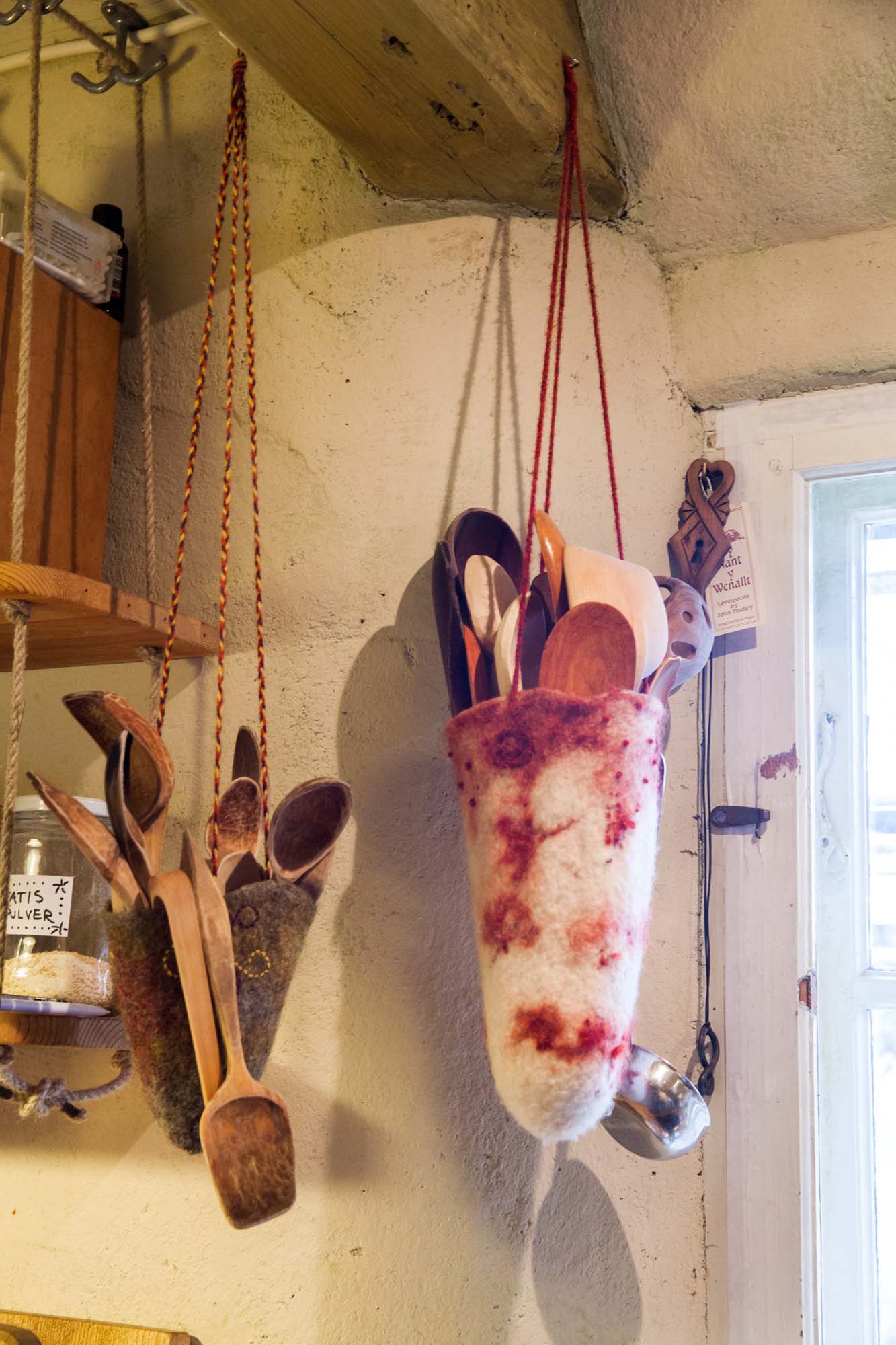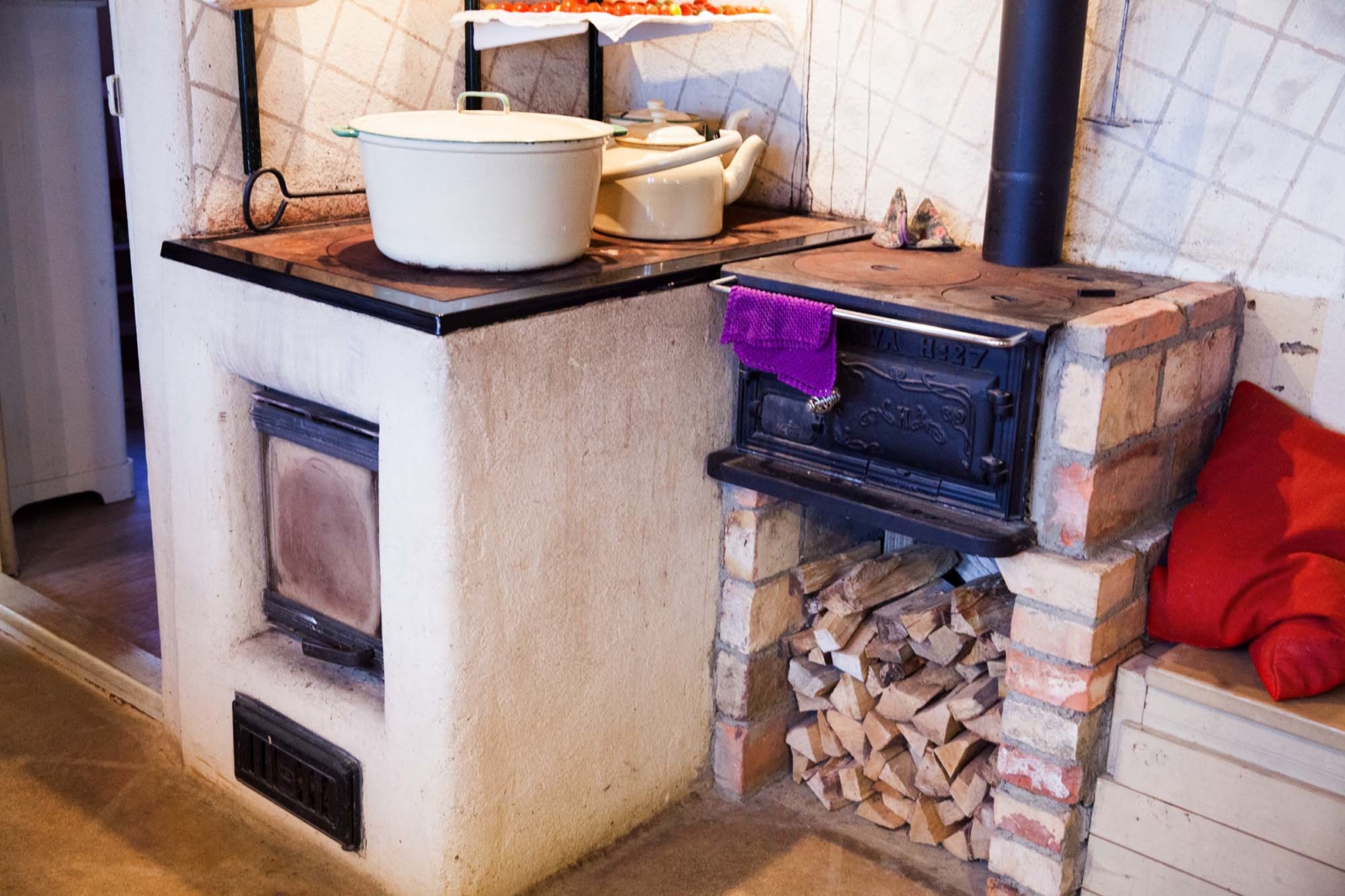 Golvplankorna knarrar och vedspisen susar. Under taket i köket hänger tovade bestickskorgar, hemsnickrade hyllor och virkade disktrasor. Funktionen har fått styra vad som hamnat var. Det här är ett kök gjort för att jobba i.