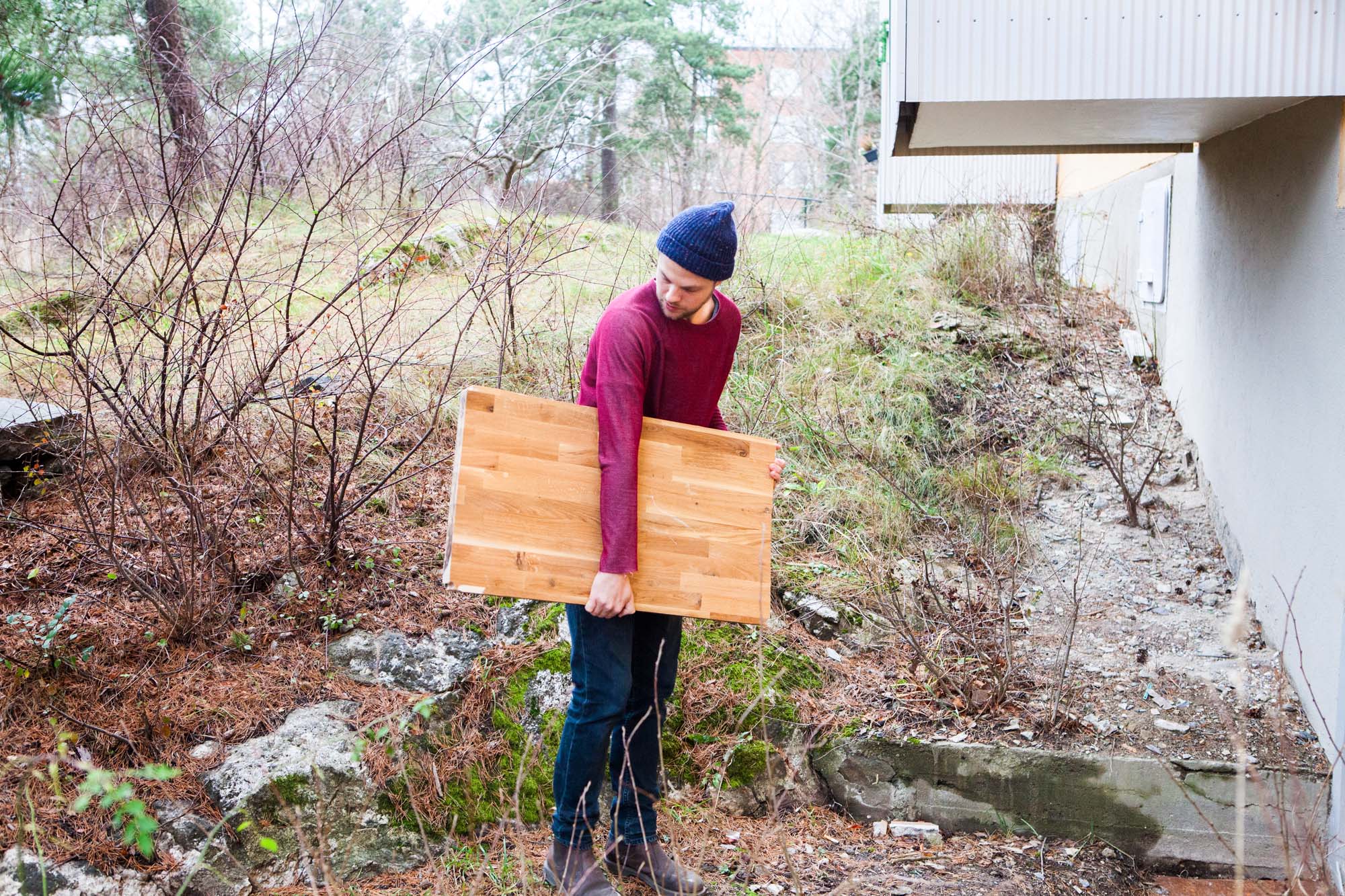 Mycket av det han använder kommer just från bortskänkessajter på nätet. Men på senare tid har han upptäckt en annan källa att fiska ur. Runt nästan varje gathörn i Stockholm står numera en orange »Big bag« med material som rivits ut vid en lägenhetsrenovering. Thomas Lissert stryker med handen över en meterlång solid bänkskiva i ek.