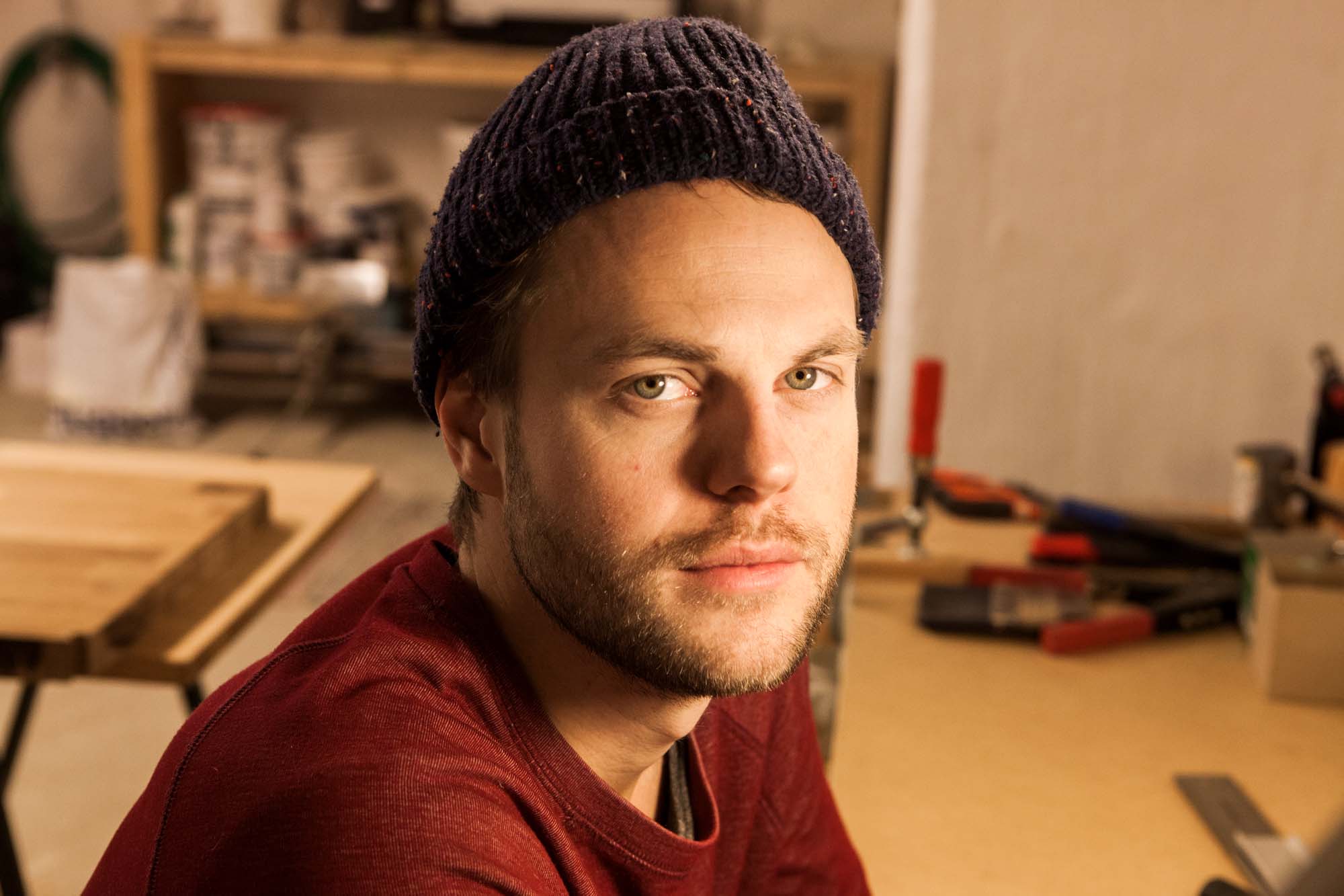 I våras gick han ut formlinjen på Beckmans Designhögskola. Examensarbetet gick ut på att han styckade och återanvände delarna från en hel soffa som han fått gratis från en bortskänkessajt på nätet. Det är den metod han nu filar vidare på i sin källarstudio. Runtom i lokalen står upphittat material lutat mot väggarna. En marmorplatta, en ljuddämpare från en bilmotor, massor av trä i olika form.