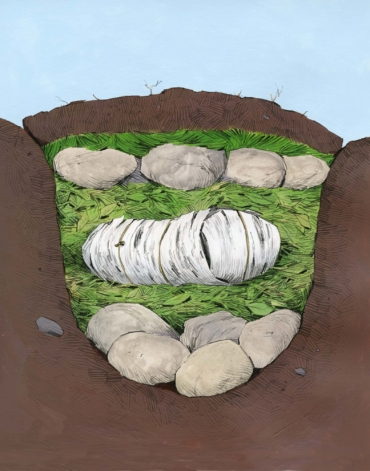 Fördela två tredjedelar av stenarna i botten på gropen. Lägg sedan ner ett lager gräs eller löv över dem för att skydda folien eller nävern, så att matpaketen inte bränner fast. Lägg den inpackade maten på grönskan och täck den med ännu ett lager gräs och löv. Toppa med resten av stenarna. Avsluta därpå med locket: Vänd grästorvan från gropen upp och ner för att hindra jord att hamna i maten. Täta så bra det går. Ingen rök ska läcka ut under tillagningen.