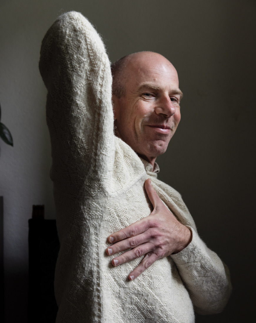 – När du har stickat upp ett nystan kan du mäta stickningen och få fram hur många kvadratcentimeter som garnet räckte till. Med geometri kan du sedan räkna ut hela ytan på det plagg som du tänkt sticka, och komma fram till hur många nystan som behövs, säger han och breder ut en tröja till. Den är vit, tvåändsstickad i ullgarn och översållad med olika slags geometriska mönster; mindre och glesare runt halsen och gradvis allt större och tätare i oket och på bålen.