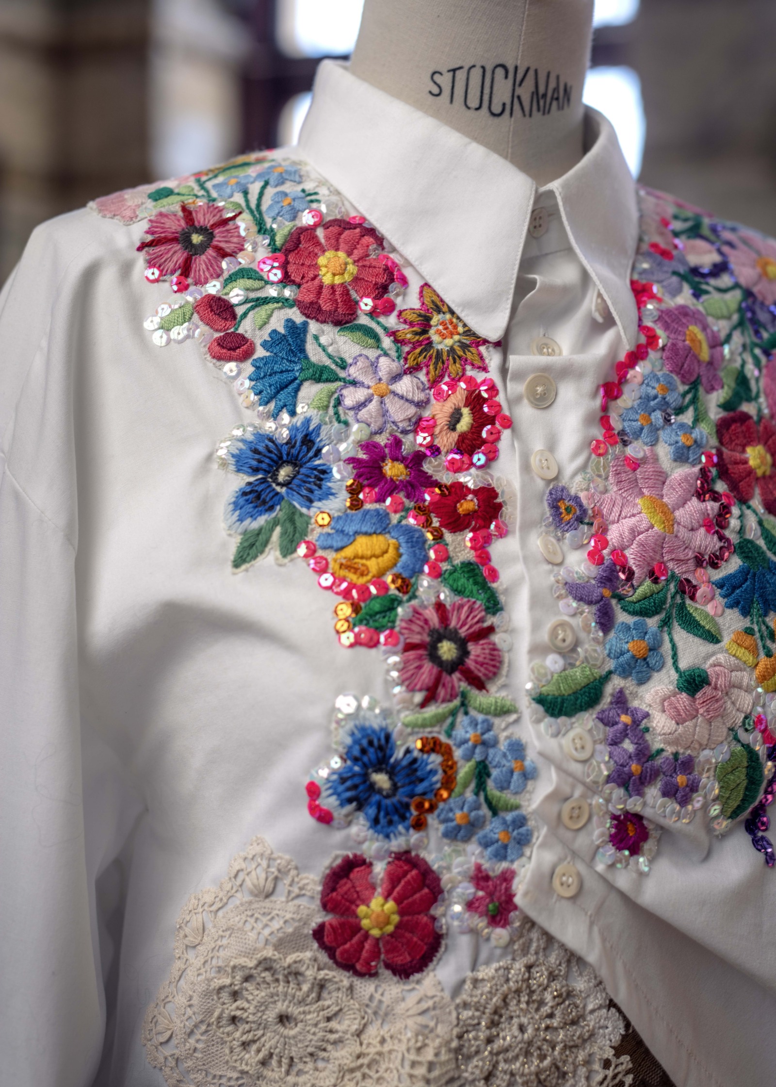 Så ofta hon kan håller hon kurser och workshops där hon visar hur hantverk kan vara nyckeln till hållbart mode. På en av arbetsbänkarna i Nina Sandströms ateljé ligger en vit herrskjorta. När hon köpte den i en second hand-butik var den som en blank canvas, men vid det här laget har den smyckats med paljetter och ett 50-tal blommor i regnbågens färger. De vita pärlemorknapparna har flyttats upp till övre halvan i ett asymmetriskt mönster för en mer intressant silhuett.