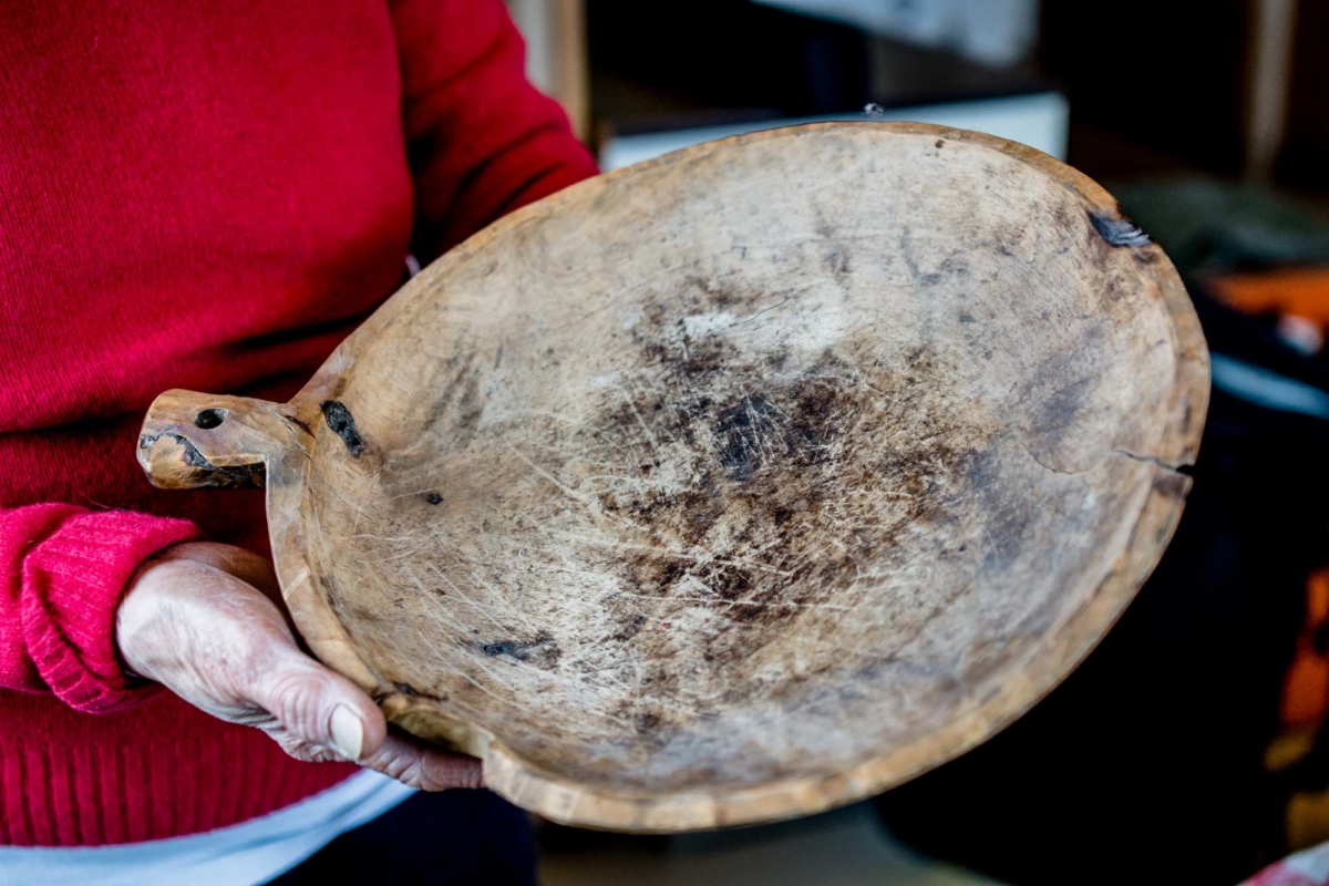 Hon reser på sig och går fram till en annan skattgömma. Plockar fram fler föremål. En till synes urgammal ostform, en kaffepåse och en större förvaringspåse i skinn. Berättar om den avlånga brickan, svijlla, som fanns i kåtan för att man enkelt skulle kunna räcka över kåsor eller koppar med kaffe till gästerna.