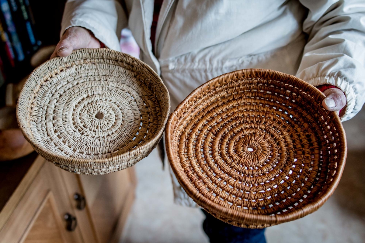 En slev finns där och några knivar. På en av dem står det »Till minne av Ebba«. Ebba Ragnhild Rimpi var Maj-Doris mor och det är hennes flinka fingrar som bundit den rotslöjd som Maj-Doris sedan plockar fram ur skåpet: En saltflaska och en magnifik, spiralflätad förvaringsask. Just saltflaskorna visar på bruksslöjdens genialitet. Genom att göra dem i rötter förblev saltet torrt, eftersom rötter drar till sig fukt. Samtidigt sväller de, vilket gör flaskan tät.