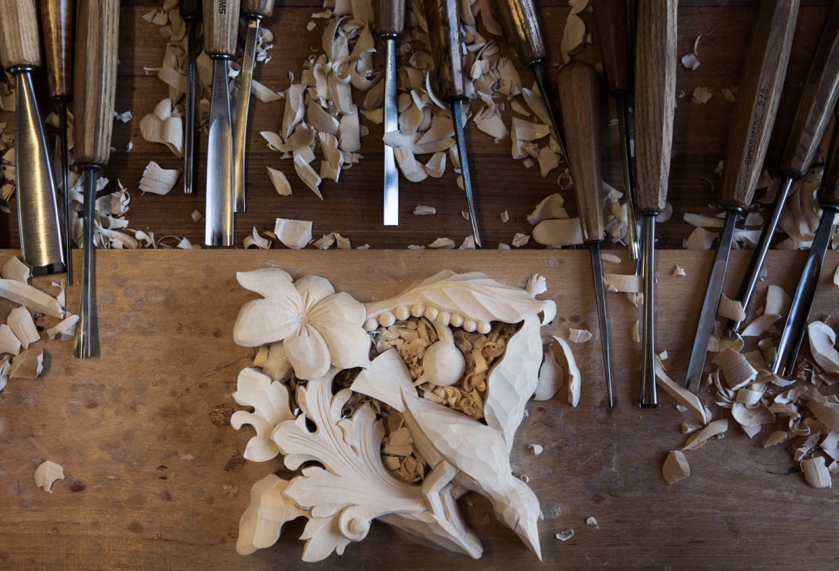 Annat var det inte minst på 1600-talet, när Vasaskeppet byggdes. Skeppet pryddes med så många fantastiska sniderier och skulpturer att de sägs ha påverkat båtens manöverförmåga. Syftet med ornamenten och konsten var både att glorifiera kungen – och att håna och skrämma fienden. Att Carsten Nilsson blev bildhuggare en gång i tiden, har just med Vasaskeppet att göra. Han läste om det som tonåring, åkte upp till Stockholm för att titta på båten, och fick sedan hjälp av en släkting att hitta bildhuggarutbildningen i Tibro, även om fokus där snarare låg på senare delen av 1700- och början av 1800-talet, än på 1600- tal. Carsten Nilsson kan än idag med lätthet räkna upp de gustavianska rokokostilarnas typiska stildrag, som »bladstavar», »fleuroner«, »kannelyrer« och »bandflätor«. Det vill säga spetsiga blad i tät rad, blommor, längsgående skåror i exempelvis stolsben och, ja, flätor. Det är också former som han fortsatt att arbeta med efter utbildningen, inte minst i det samarbete med en möbeltillverkare som kom tillstånd direkt efter examen 1996, då han gjorde »fleuroner« i sängben och skar blommande sängknoppar i gustaviansk anda. Det var en bra skolning, säger han, för han »fick snida och fick upp hastigheten«.