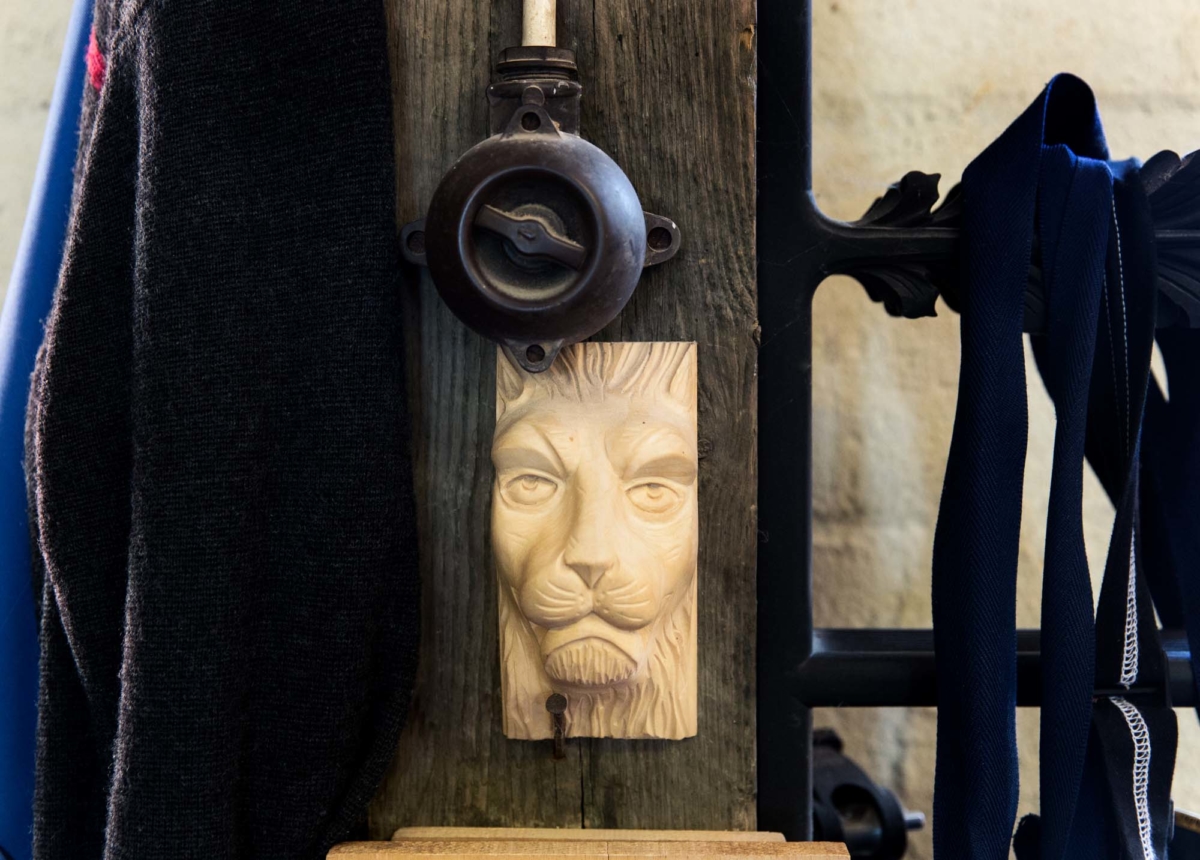 Det hänger en omålad, trä-ren vapensköld på väggen i verkstaden, prydd med precist utformade svärd i relief, genombrutna, buktande eklöv och fladdrande fanor.