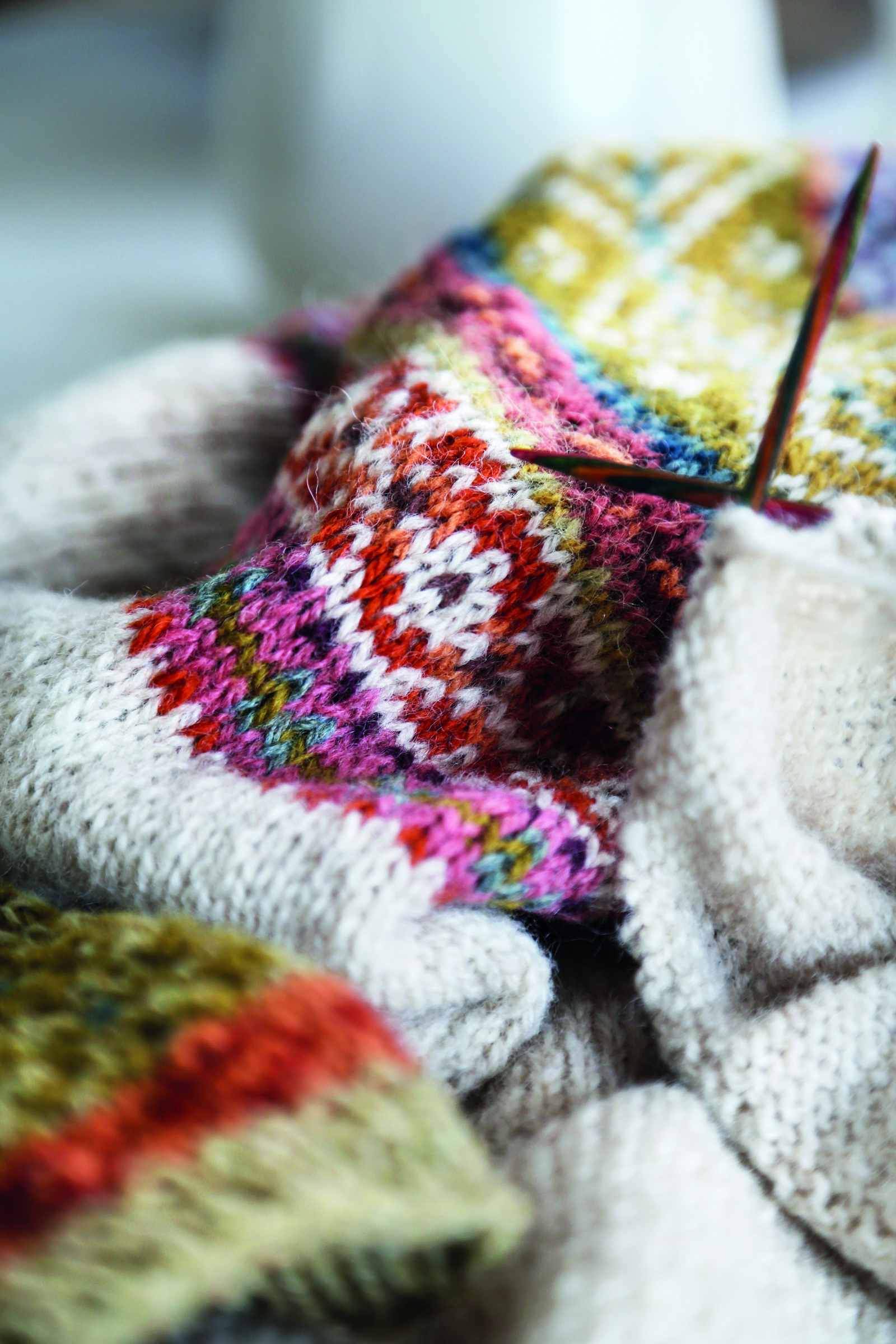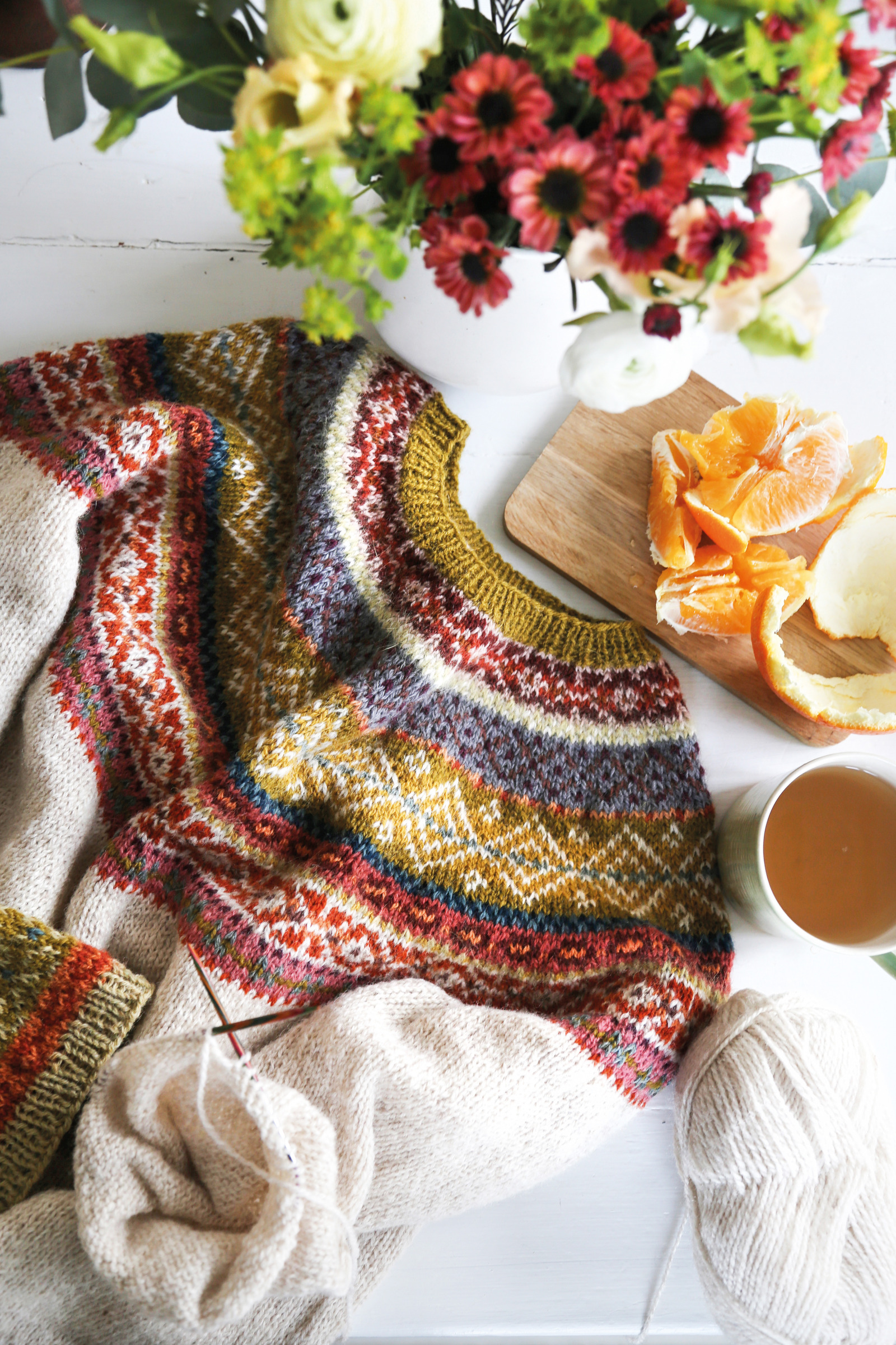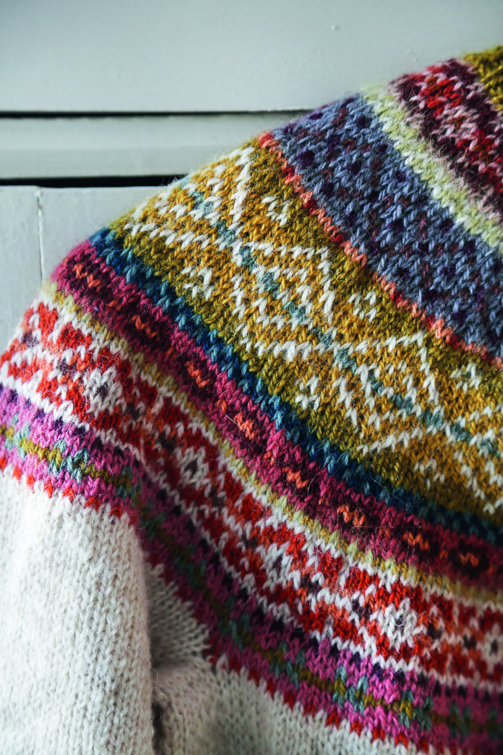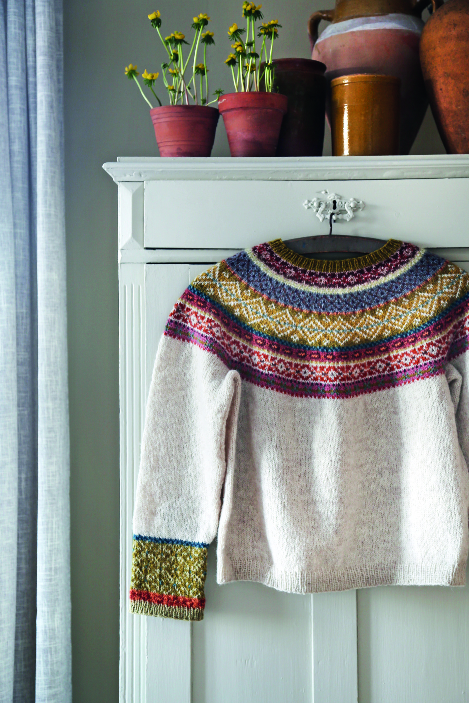 Hulda stickas upp ifrån och ner med tolv färger i okmönstret. Själva bålen är enfärgad och ärmarna har en dekorativ bård längst ner. Du får beskrivning till både kofta och tröja.