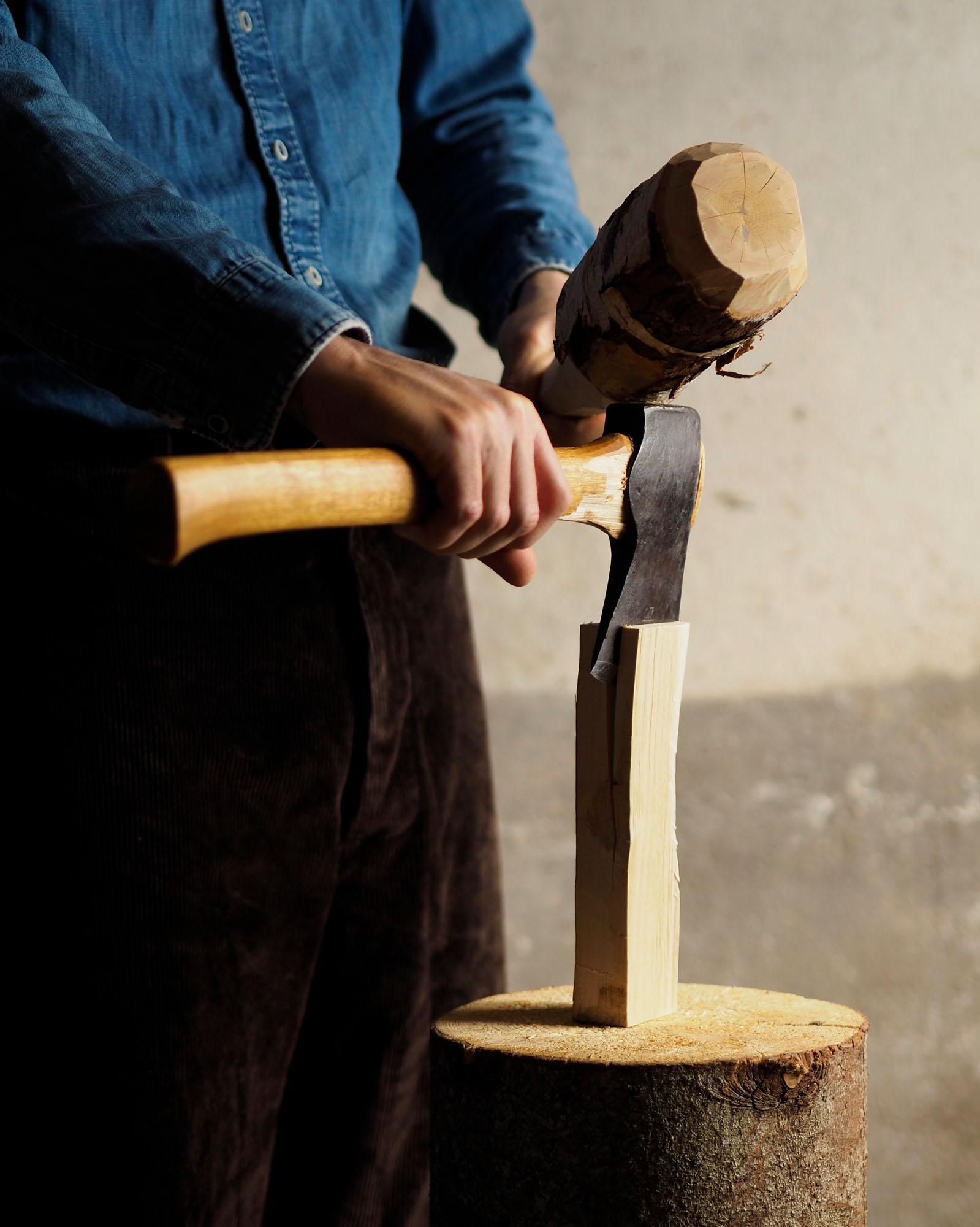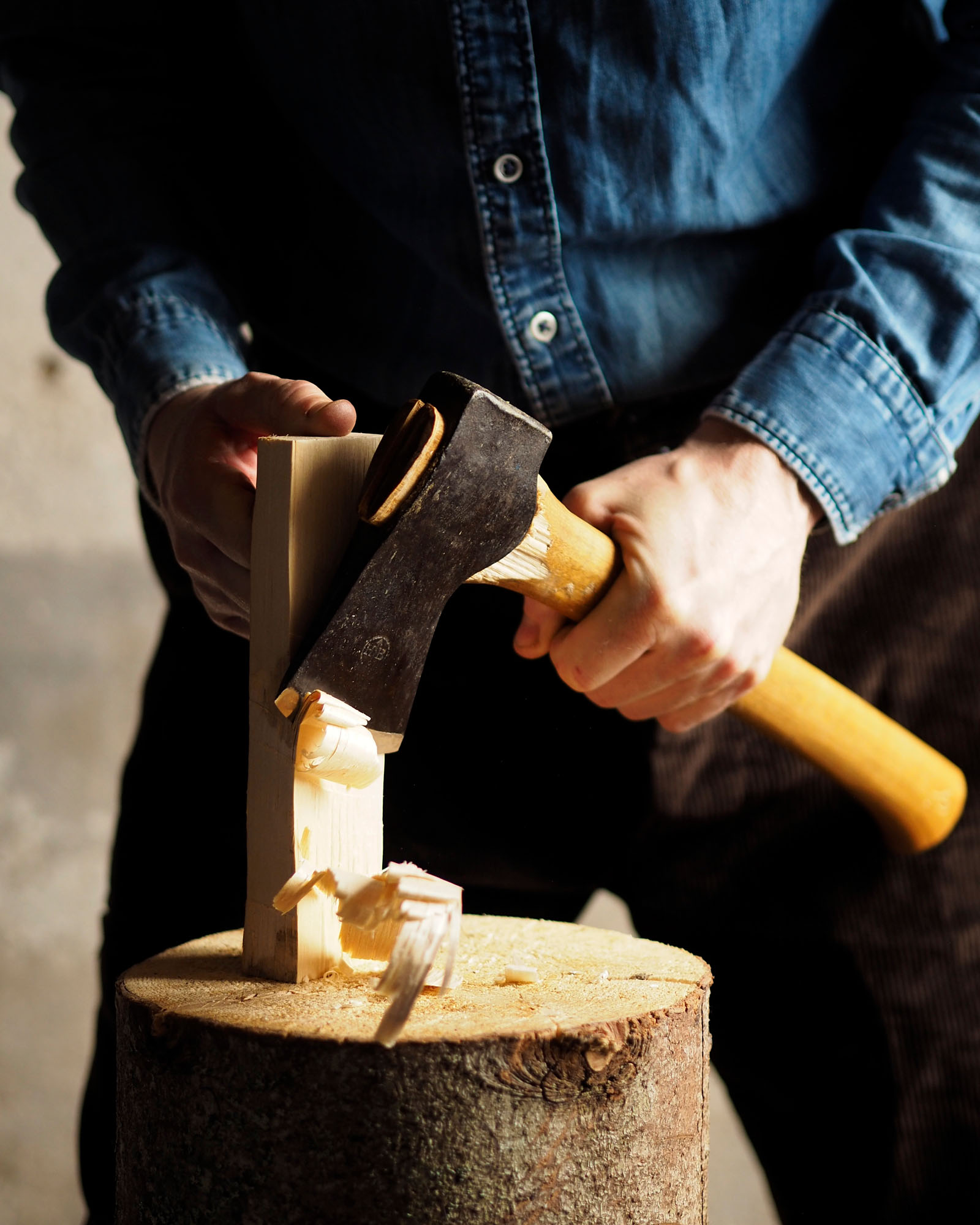2. Tälj bakstycket jämntjockt med yxan och se till att alla sidor är plana. Det räcker om du använder ögonmått för detta så får du ett livfullt uttryck. Tälj sedan rent med kniven längs långsidornas kanter.
