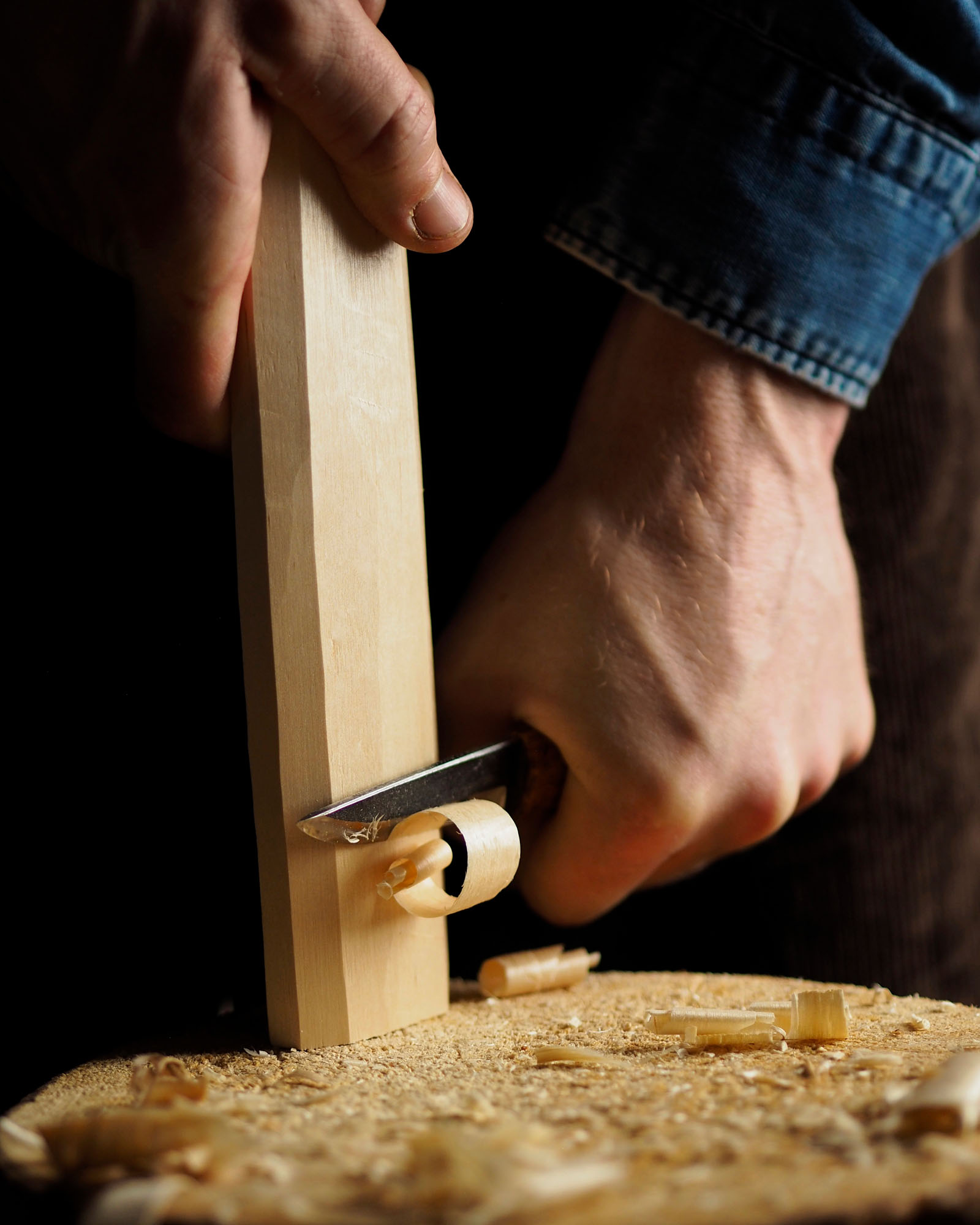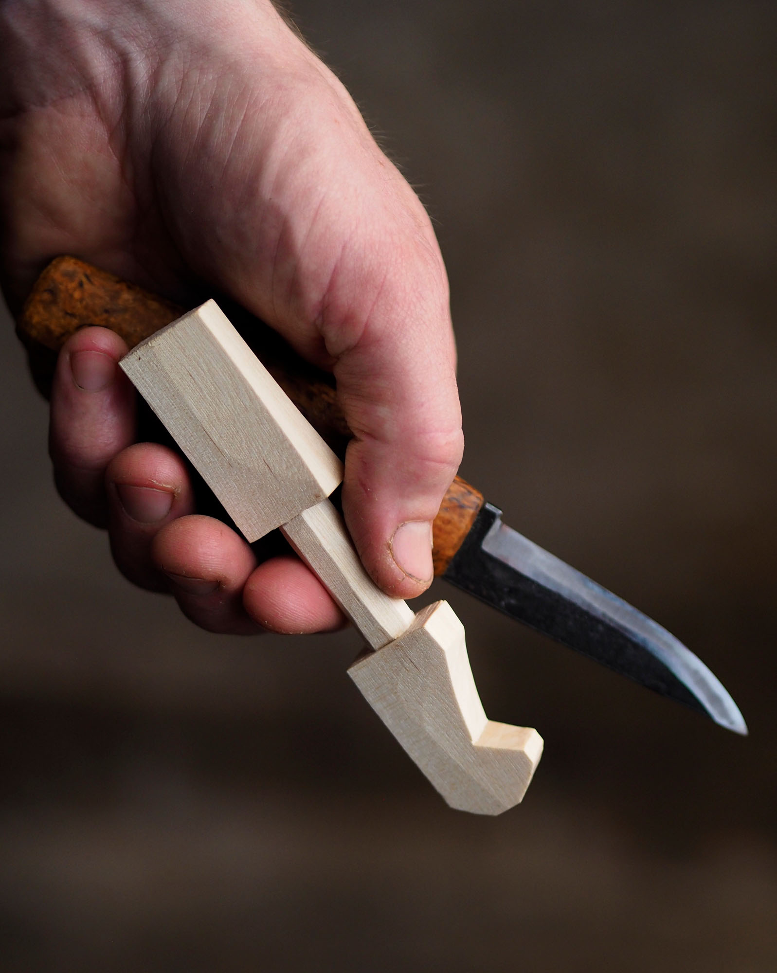 6. När tappen är klar täljer du till knoppens form. Börja med att tälja ämnet lite avsmalnande mot änden. Tälj en flack V-form på knoppens ovansida så att det bildas ett litet hak längst fram. Avsluta med att lägga faser på alla kanter. Såga itu biten på mitten. Borra också två mindre hål för väggmontering.