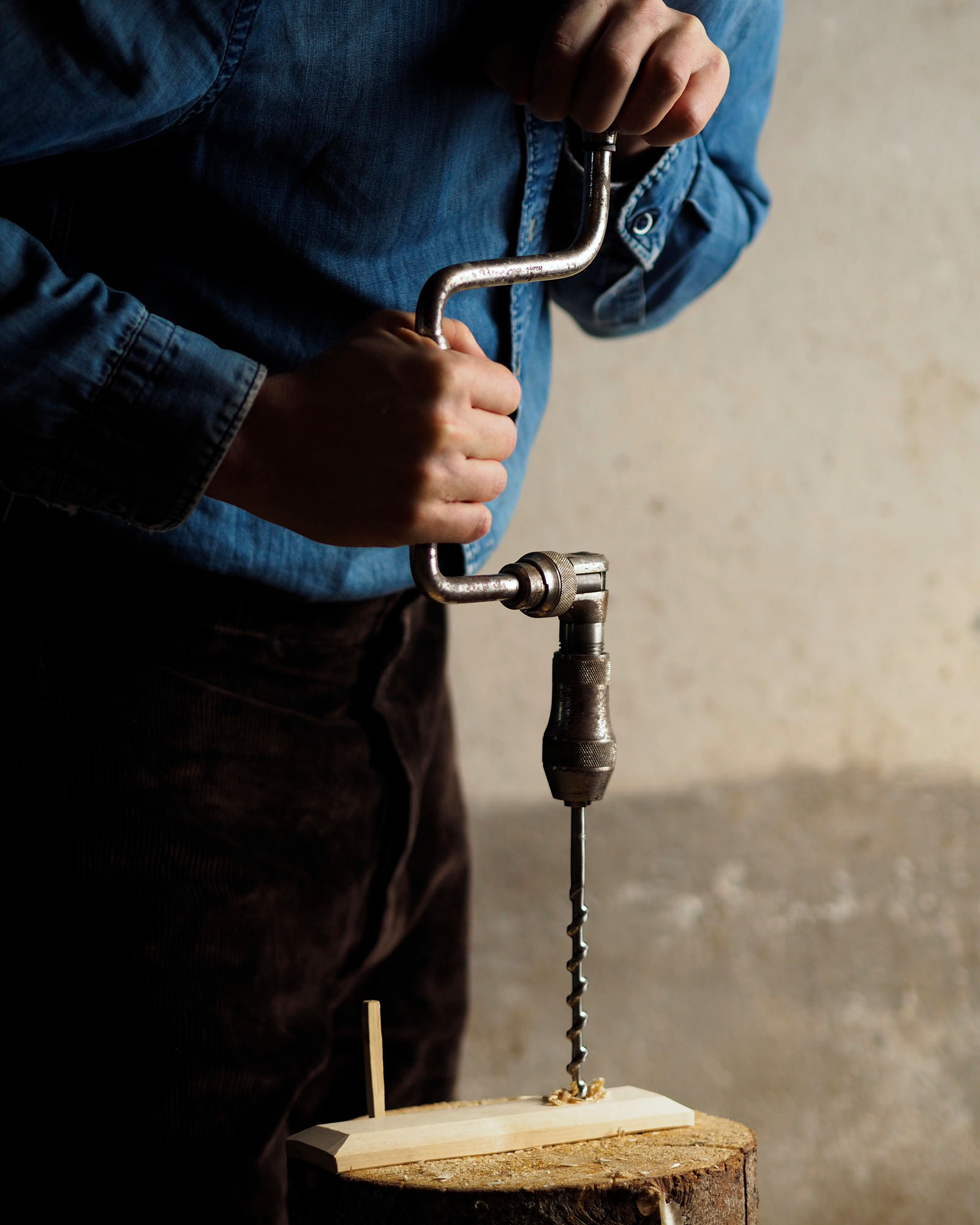 4. Borra hålen för knopparna. Borra först från framsidan tills du precis går igenom med spetsen på borren, vänd sedan och borra klart från baksidan för att undvika spjälkning. Anpassa storleken på borr efter knoppen så att du får en lagom tjock tapp. Frej använde en 11 mm-borr.