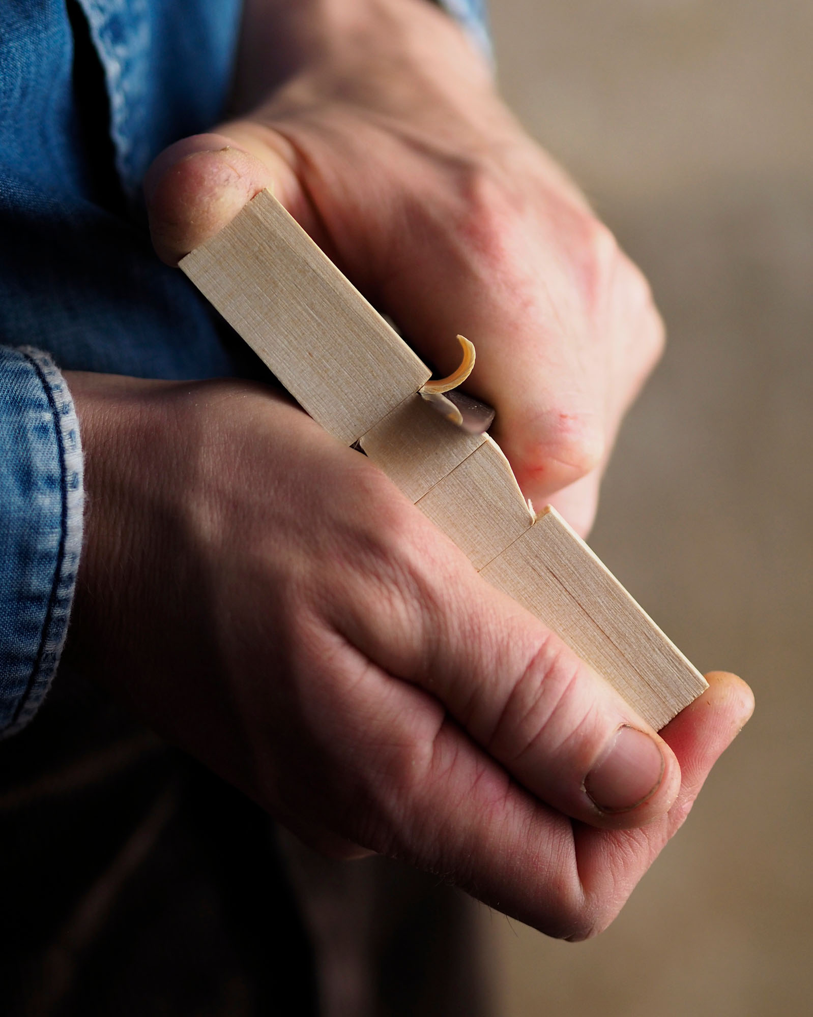 5. Knopparna täljs med fördel i par. Det gör det lättare att få tapparna raka och ger dig också något mer att hålla i under tiden. Klyv ut och tälj till ett knoppämne som är lika långt som knoppens längd x 2 + bakstyckets tjocklek x 2. Frej utgick från ett ämne med rektangulärt tvärsnitt på 20 x 15 x 120 mm. Markera bakstyckets tjocklek på var sida om mittpunkten på ämnet. Tryck med kniven rakt ner på denna punkt runt om hela stycket för att kapa fibrerna och markera tappnacken. Tälj sedan bort material från mitten och ut mot tappnacken. Kapa fibrerna igen och tälj bort material, upprepa tills du nått rätt diameter på tappen. Här lönar det sig att vara noggrann och använda ett skjutmått.