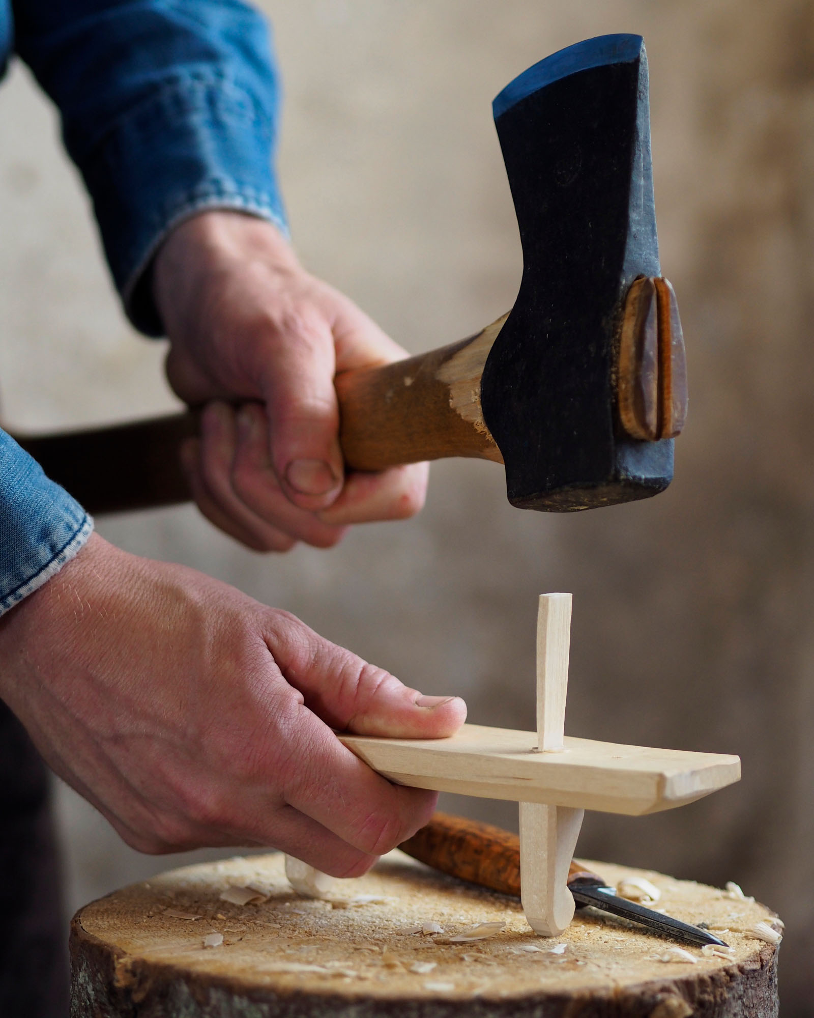 7. Passa in knopparnas tappar i hålen. Kila knopparna med en nätt kil som placeras vinkelrätt mot fiberriktningen på bakstycket.
